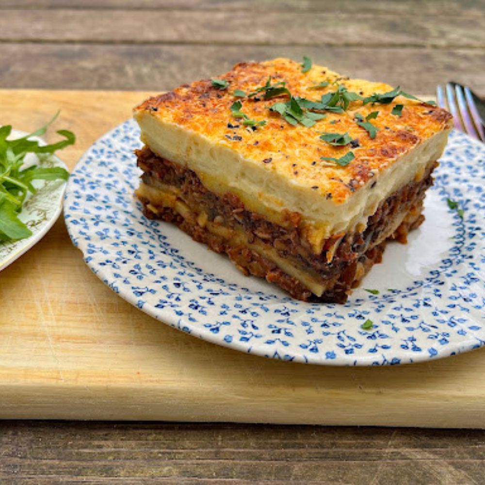 A bristolKTCHN favourite. A single portion of classic moussaka, but vegetarian - the rich ragu is made with puy lentils and mushrooms cooked down with red wine, oregano and cinnamon, but the rest is just the same: layers of aubergine and potato, topped off with a cheesy bechamel.