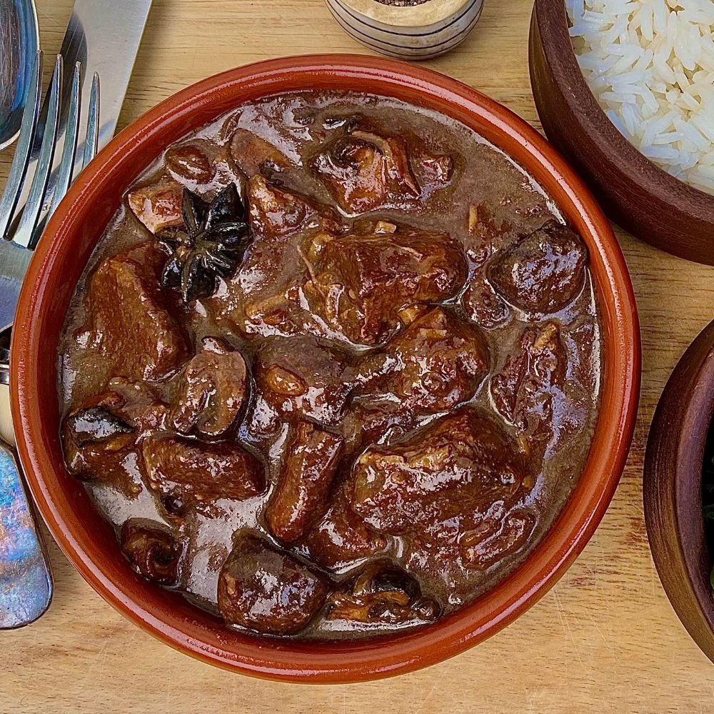 Beef, onion, garlic, ginger, chestnut mushrooms, chinese five spice, star anise, beef stock, brown sugar, dark soy sauce (contains wheat), tamarind